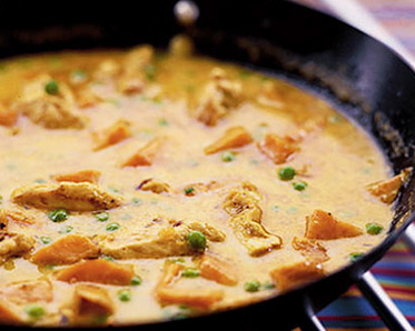 - Heat the oil in a deep frying pan or wok, stir in the curry paste and fry for 1 minute. Add the chicken, sweet potatoes and lentils and stir to coat in the paste, then pour in the stock and coconut milk. Bring to the boil, then simmer for 15 minutes.